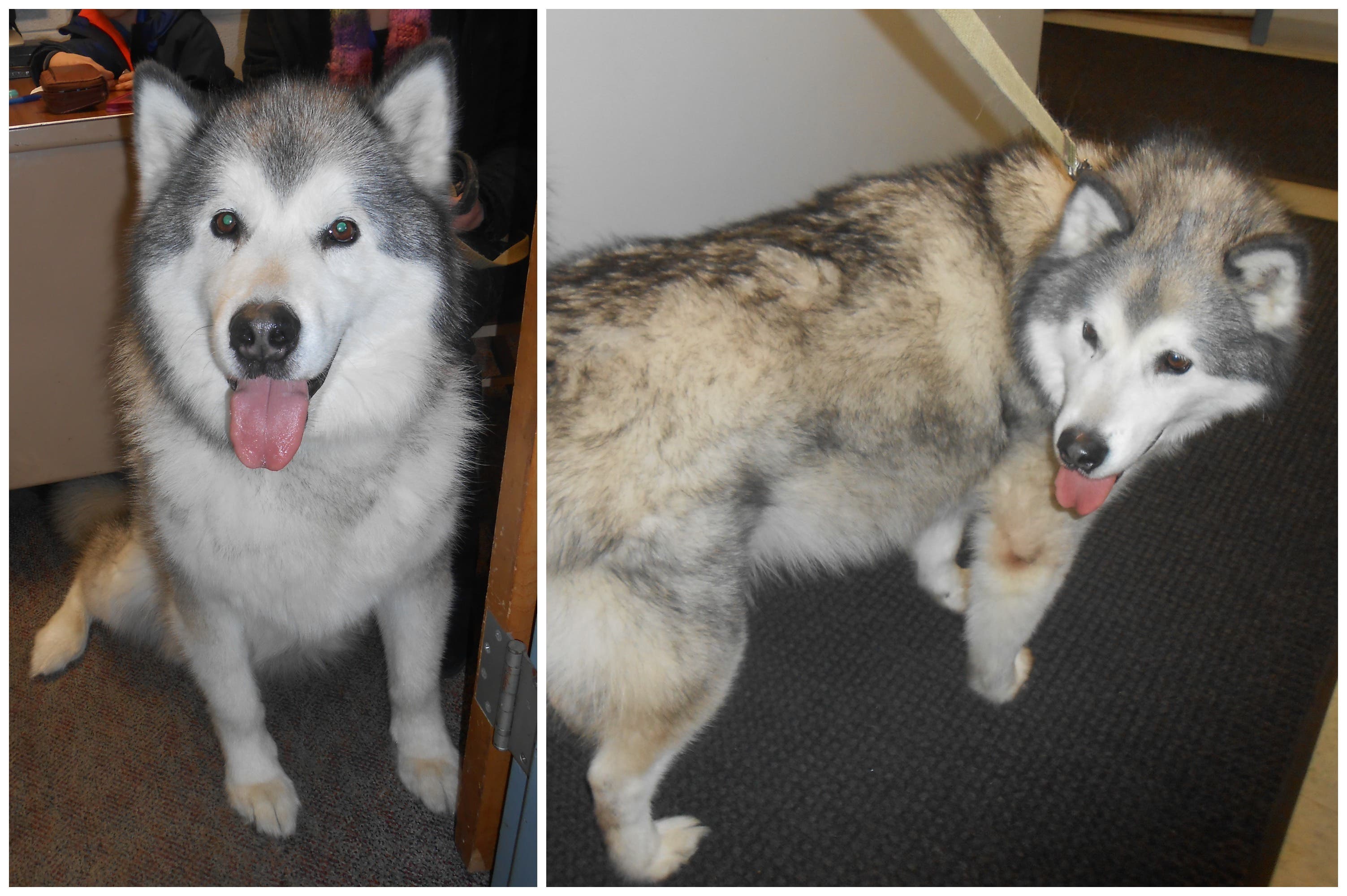 The dog had a gray cloth collar without tags. It is white and gray and weighs about 110 to 120 lbs. A foster family, according to Thomas, is currently caring for the Malamute.