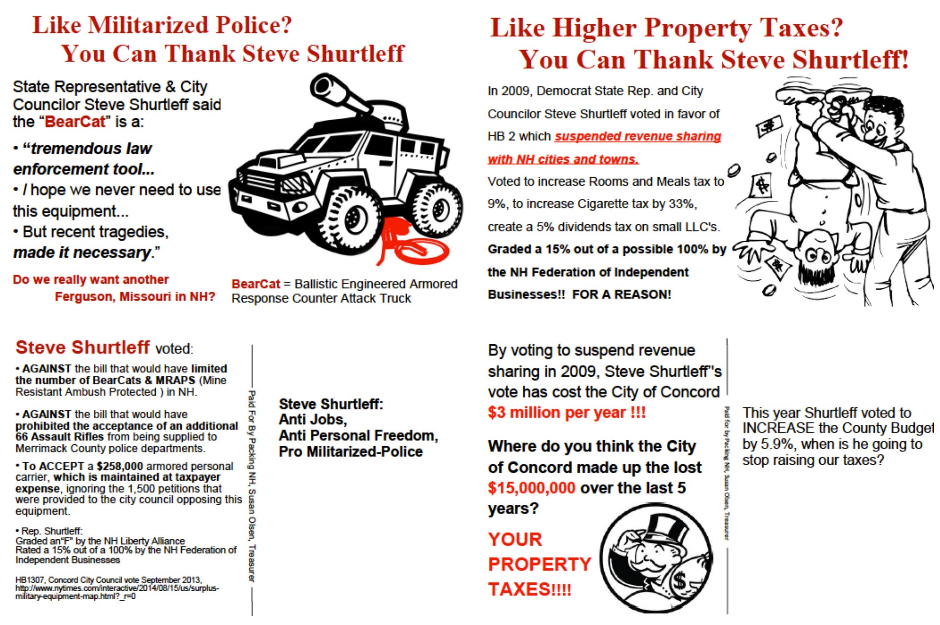 The mailer pointed to a 2009 vote by Shurtleff which suspended revenue sharing with New Hampshire cities and towns and required the city to pass most of the cost of doing business onto the local property taxpayers of Concord and Penacook. The mailer also pointed to other tax increases, including on rooms and meals and cigarettes, and a 15 percent rating out of 100 with the New Hampshire Federation of Independent Businesses as reasons not to vote for him for re-election.