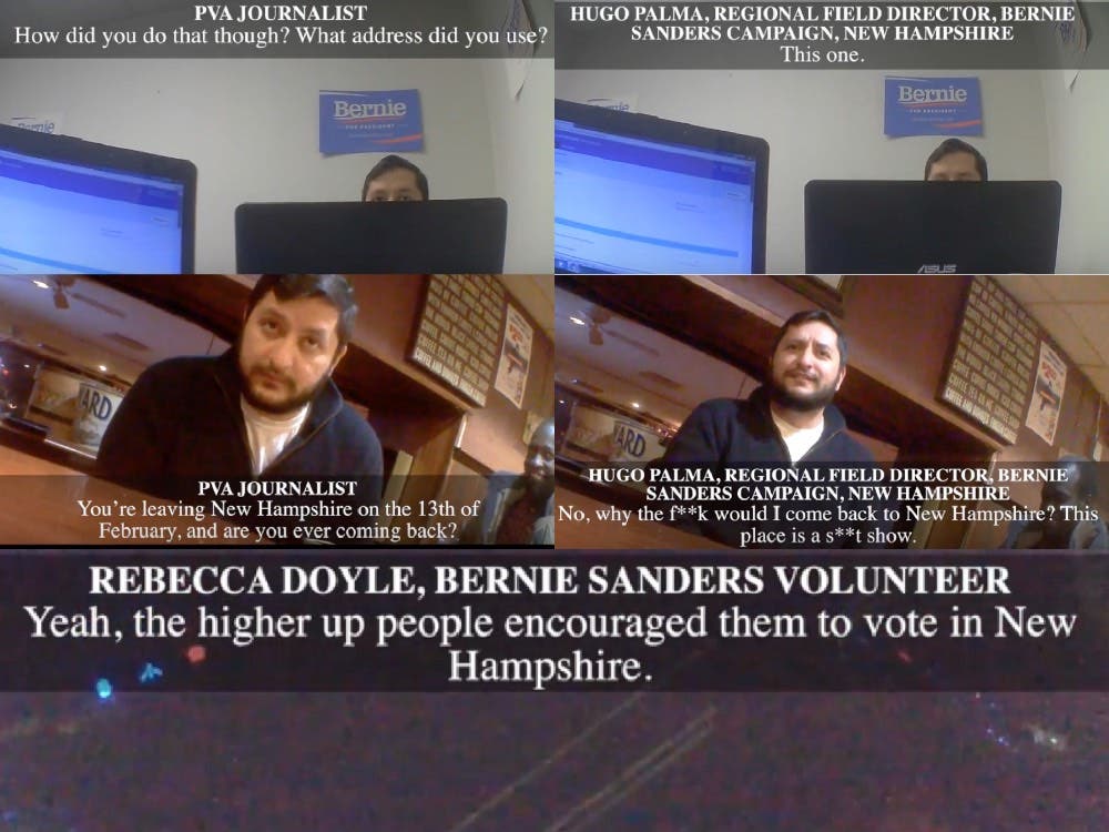 Two campaign staffers – Hugo Palma Jr. and Donna Waterman – reportedly registered to vote using the office’s address – 345 Cilley Road in Manchester – as their “domicile” location. Palma, the video noted, lives in Colorado and was crashing with other Sanders supporters in Warner while working as a regional field director for the primary.