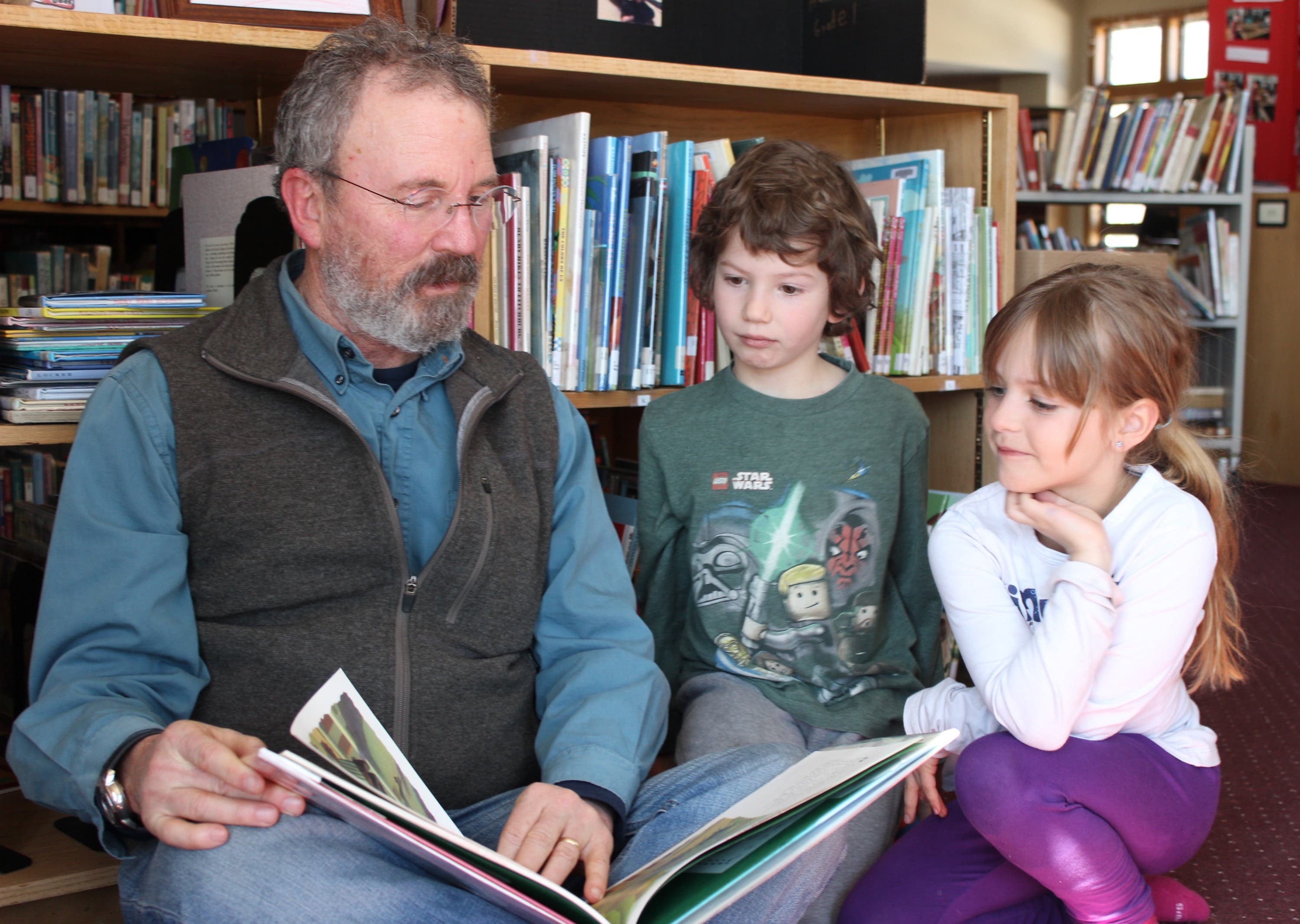 Caption: Sant Bani’s Head of School Dr. Kent Bicknell reads Henry Hikes to Fitchburg by D.B. Johnson to first graders Henry Pearsall and Grace Wujcik
