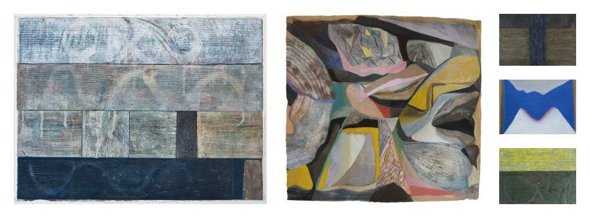 The prints of Amparo Carvajal-Hufschmid are abstract compositions which combine various textures and slight color shifts. In her current Hobo Series she employs the iconography developed by hobos to communicate with each other. “These pieces are quite painterly and include a lot of hand gesture as I apply pastel, wax and graphite to the surface” says Amparo. “I use blocks of wood like other artists use brushes, running each section through the press multiple times to achieve a nuance of color.”