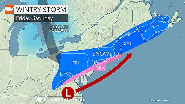 AccuWeather.com is calling for snow to hit the area on Friday night and last through Saturday and while it won’t be a ton of the white stuff, it is expected to create slushy and slippery driving during the evening commute, especially on bridges and overpasses, and in suburban and inland communities.