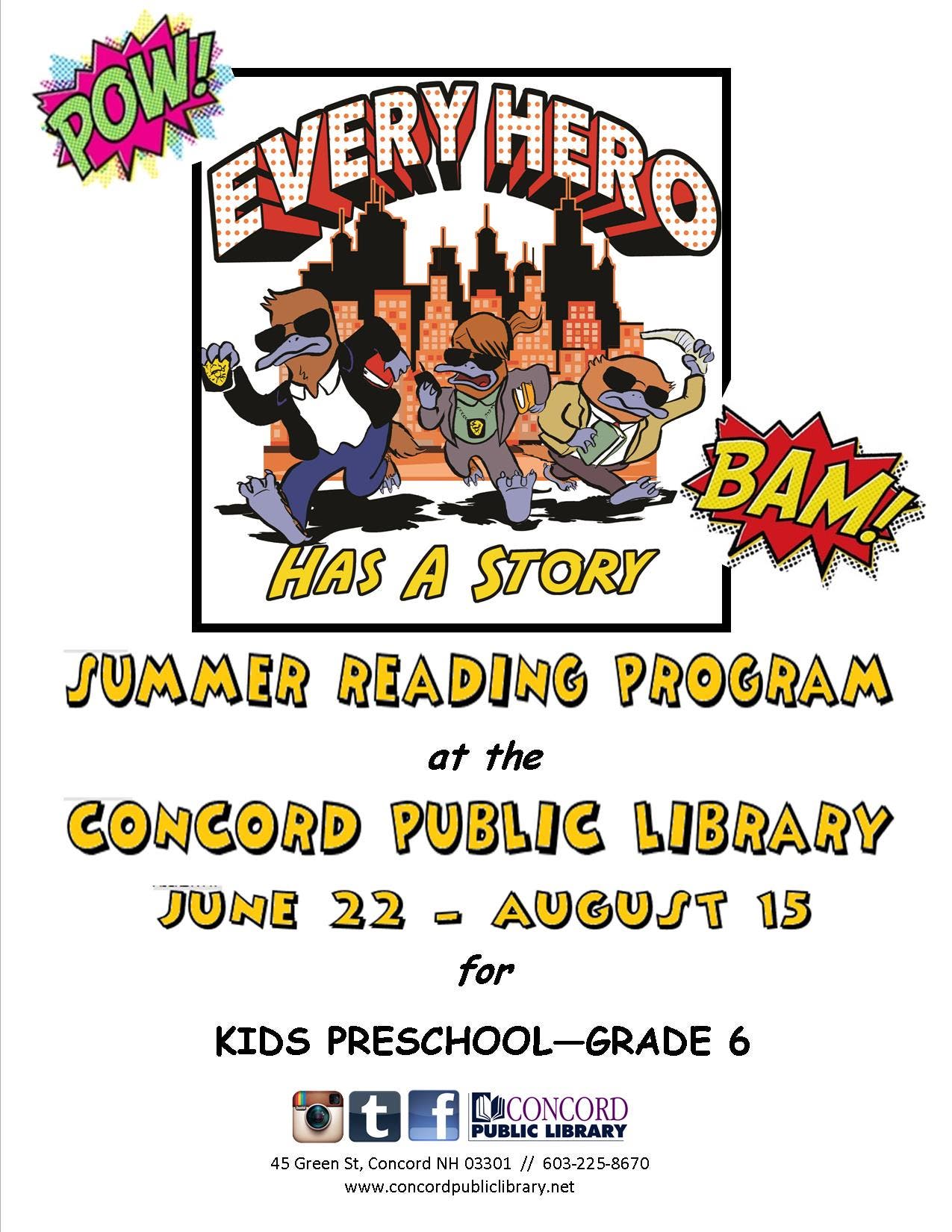 Join us at the Concord Public Library for “Every Hero Has A Story” Summer Reading Program for children in pre-school to grade 6.