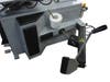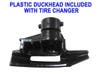 The top of the machine uses a large turntable (24″ or 26″), which is thick and rugged and ready to handle large wheels. Behind the wheel clamps there are air jets, the part of the bead blaster which assists in seating the bead for mounting tires. The air supply tank is housed in the upright tower, eliminating the need for an exterior tank. The adjustable air regulator and water trap is mounted beside the automatic oiler, which is necessary to keep the machine lubricated – where there is compressed air, there is often moisture. The oiler drips oil into the machine each time you use a foot pedal function, spreading lubricant throughout the system and limiting wear on parts. It is easy to fill, just spin off the reservoir, on and off in a minute. Strong large cylinders under the turntable move the rim clamps in and out and provide a solid grip on wheels. The steel duck head — which removes and installs the tire on the wheel — is lined with plastic inserts to protect against damage to wheels. This all-platic duck head is included as a standard piece. It may be installed when working with high end wheels which are fragile. Other brands charge for this as an option, usually $70-$100. Consider calling us today for a tire changer that fits your needs and budget. Phoenix Tire Changers are quality machines at an affordable price.