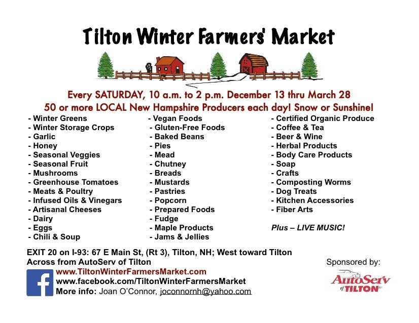 Enjoy an indoor Tilton Winter Farmers’ Market every Saturday, starting on Dec. 13th, January, February and March from 10:00am - 2:00pm. More than 50 Vendors with amazing fresh winter greens, vegetables, fruits, dairy, baked goods, prepared foods, mushrooms, tomatoes, breads, coffee, dairy, cheese, jams, jellies, soups, baked beans, fudge, popcorn, wine, mead, eggs, garlic, fudge, honey, dried beans, garlic, maple products, herbal products, vegan, gluten free, dried beans, body-care, dog treats, artisans, chair massage, info on composting worms and too many items to list! Listen to our amazing Musicians!