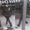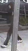 Surveillance video shows a white male walk past the store font at approximately 4:25 a.m. This subject is wearing a black hooded sweatshirt with a design on the front and back. He had on black pants with white or light colored sneakers. His face was covered by the hood.