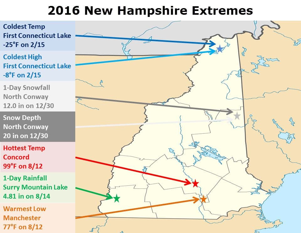 The highlights include the very cold temperatures the state experienced in February after some extremely cold weather crossed the eastern part of the state. The nor’easter this week also set a couple of records for the year, including most snowfall in 2016 – 12 inches in North Conway – and snow depth – 20 inches. The hottest temperature was 99 degree in Concord on Aug. 12.