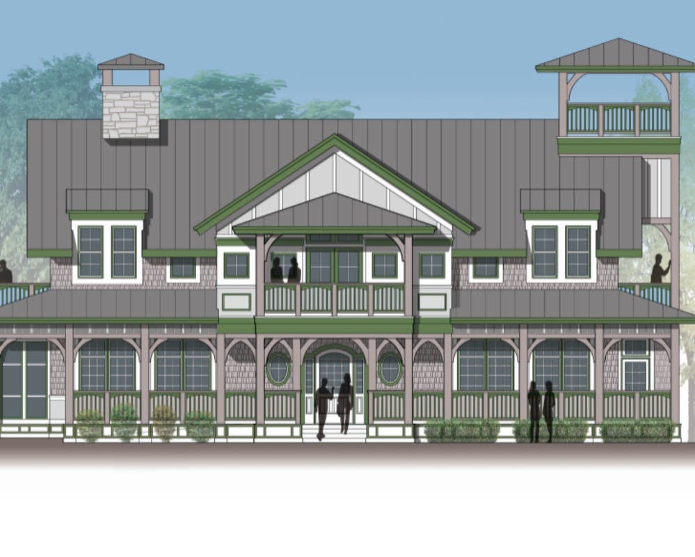 An architectural rendering by Jeff Demers Design shows a distinctive 5,900 square foot shingle style clubhouse with wide porches and three privately owned apartment condos upstairs. The Bungalow Club sits in the center of the new neighborhood called “Porches at Exeter,” which features 11 cottage town homes along the river and the three flats above the Clubhouse.