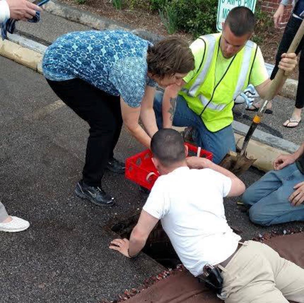 EXETER, NH - Exeter Police posted a number of photos of a duckling rescue in town on April 22, 2016. According to the post, 11 ducklings fell into a sewer pipe while the mother and other ducklings were standing by. A sergeant, detective, and DWP employee helped grabbed them up out of the sewer.
