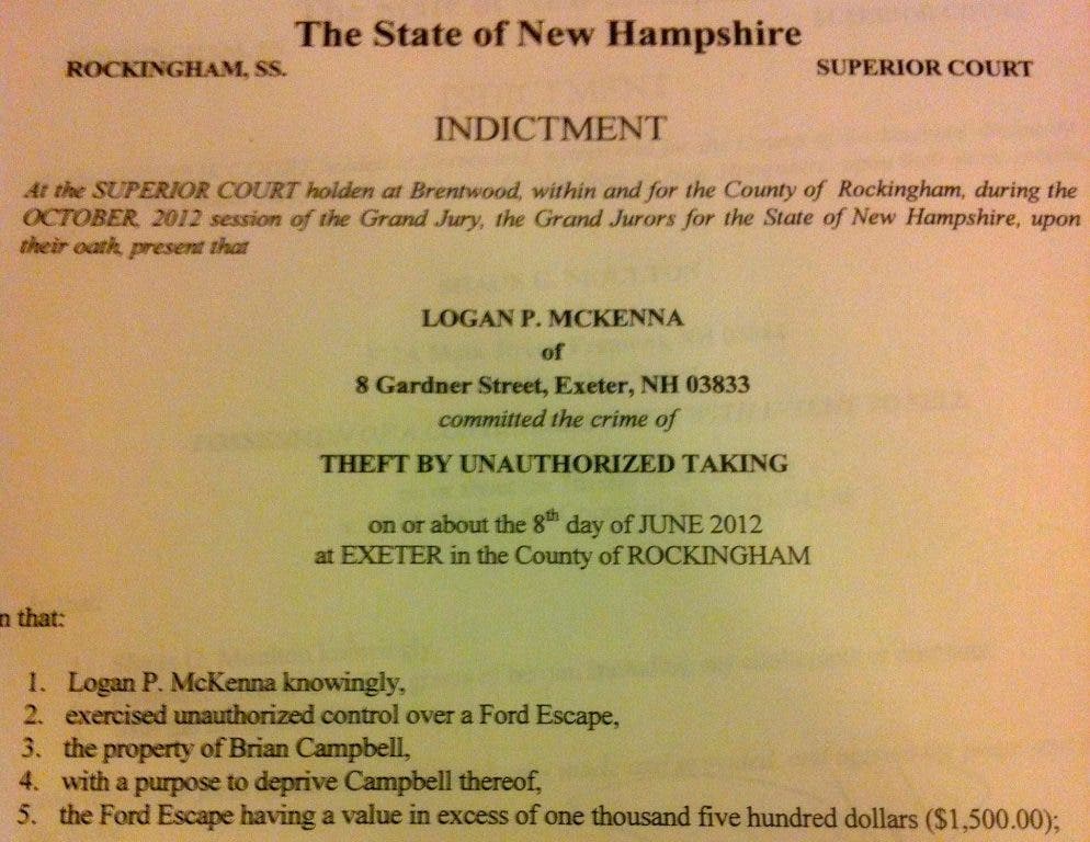 Logan P. McKenna, of 8 Gardner St., was charged with stealing a Ford Escape in June. The vehicle was valued at more than $1,500.