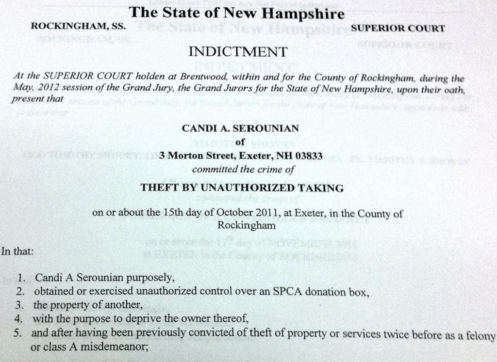 Candi A. Serounian stole from the box on Oct. 15, 2011, according to court documents. She was recently indicted on the charge in Rockingham County Superior Court.