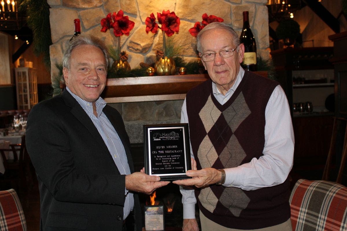 Hampton Area Chamber president Doc Noel (right) presents plaque to Chuck Rolecek, owner of CR’s The Restaurant, in recognition of their Premium Membership.