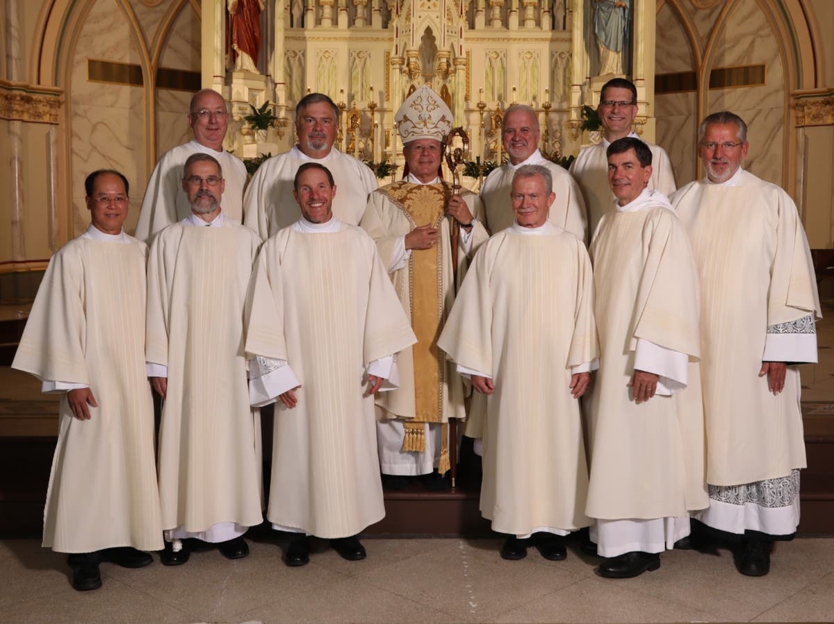 Caption: Back row, left to right: Dc. Terry Sullivan, Dc. Richard Hilton, Bishop Peter Libasci, Dc. Kevin Cody, Dc. Leland Fastnacht. Front row, left to right: Dc. Lam Tran, Dc. Karl Cooper, Dc. Joseph Dion, Dc. Fintan Moore, Dc. Stephen Kaneb, Dc. Randy O’Neill. Credit: Jeff Dachowski.