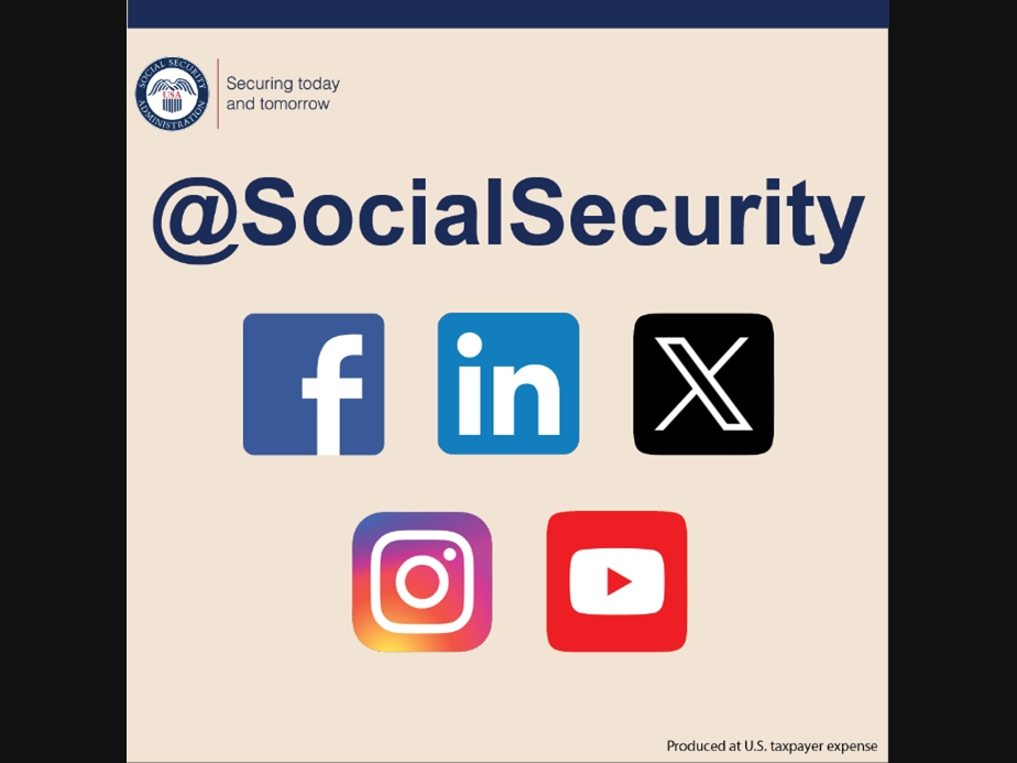 You can find a full list of our social media channels at www.ssa.gov/socialmedia. Connect with us on social media to learn helpful information and ask general questions. But remember, you should never post personal information on social media. Follow along and share our pages with friends, neighbors, or loved ones today.