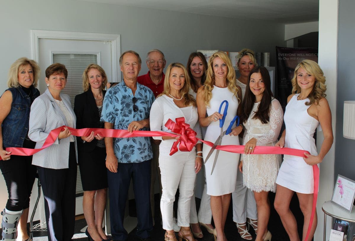 Pictured (from left): Pat Morgenstern, Hampton Area Chamber; Doreen Austin and Karen Andronaco, Optima Bank & Trust; Paul Lepere, The Hamptons Real Estate; Doc Noel, Hampton Area Chamber; Sheila Cragg, Esthetician; Kristen Gilbert, Esthetician; Tara Delle Chiaie, Nurse Practitioner and Owner (with scissors); Melody Fowler, Massage Therapist; Ilianna Paschaldilis, Nutritionist; Katrina Higgins, Aesthetician and Lash Specialist.