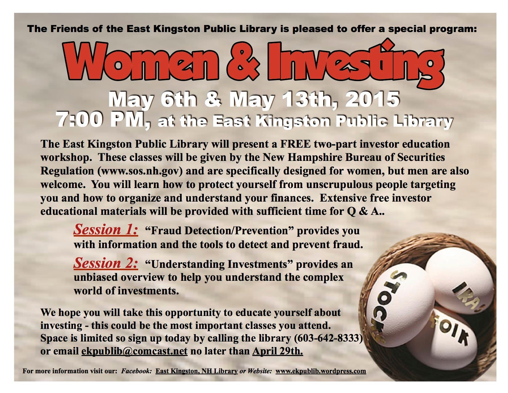 The East Kingston Public Library will present a FREE two-part investor education workshop on Wednesdays, May 6th & 13th, 7:00 PM at the Library , 47 Maplevale Road, East Kingston, NH. These classes will be given by the New Hampshire Bureau of Securities Regulation (www.sos.nh.gov) and are specifically designed for women, but men are also welcome. You will learn how to protect yourself from unscrupulous people targeting you and how to organize and understand your finances. Extensive free investor educational materials will be provided with sufficient time for Q & A.