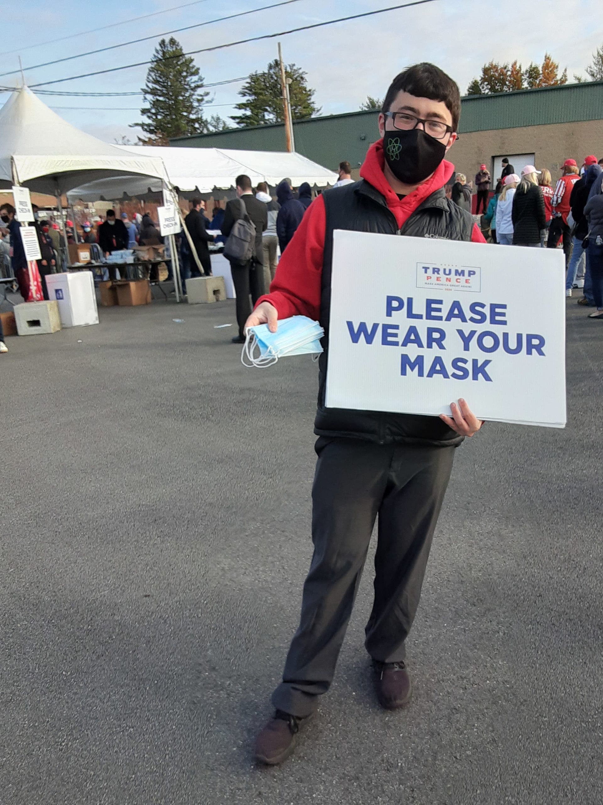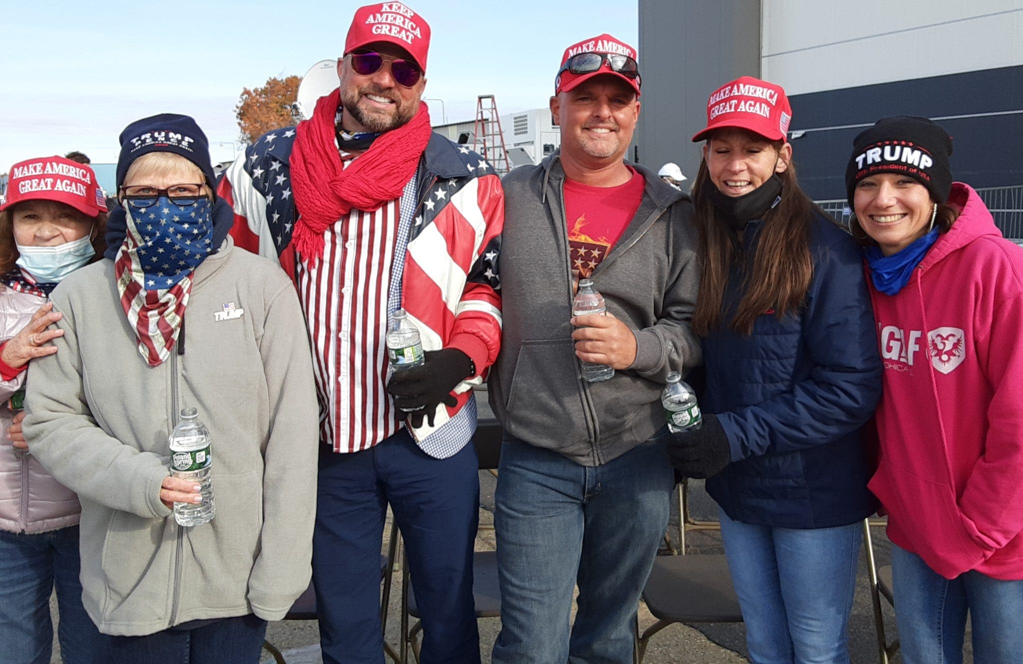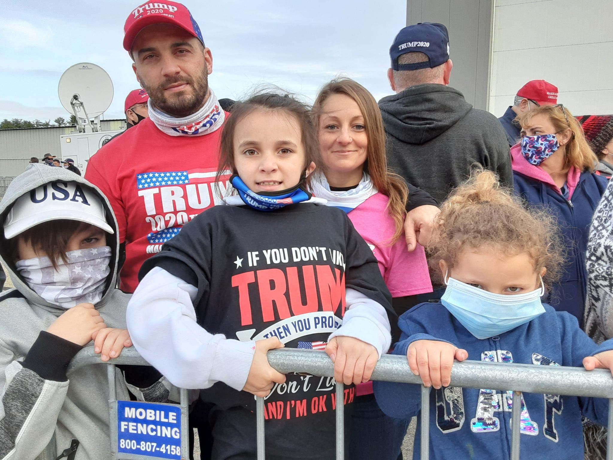 Standing room only and brisk winds didn’t dampen the excitement of Phillip Aldrich Jr., 8; his sister, Amarysse Aldrich, 7; and 4-year-old Kinsley Rea who shouted “Trump 2020” under her mask. They were joined by Phillip Aldrich Sr. and Brittany Stevens, all of Biddeford, Maine. Credit: Mary Helen Gillespie