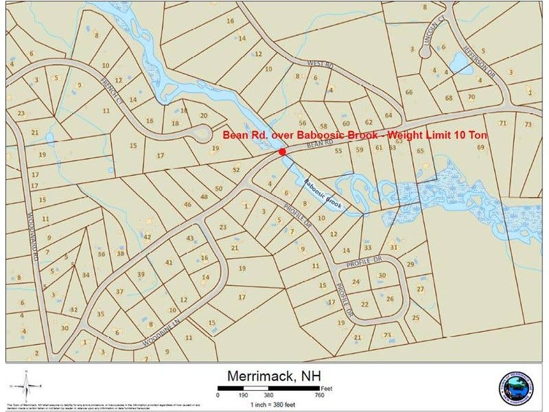 The Bean Road Bridge, which runs across the Baboosic Brook in Merrimack, has been closed, according to town officials.