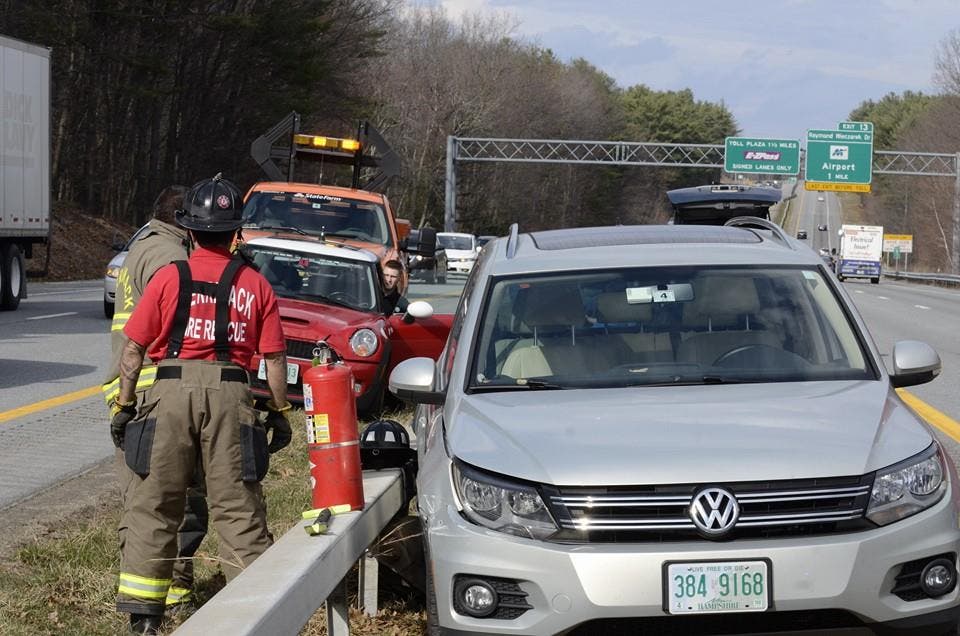 MERRIMACK, NH - A four-vehicle accident was reported on the Everett Turnpike North just before the exit to the airport at around 4 p.m. on April 1, 2016. The accident was cleared at about 5 p.m., according to the NH DOT. Four vehicles were involved in the crash, after the first vehicle lost control and created a chain collision, according to Jeffrey Hastings, who took these photos.