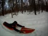 It is because of the invention’s stiffness and rigid construction, solid handles, and its steel edges or runners that make it possible for the operator to have positive control of their their trip down the snow covered gradient, and why they are able to steer safely away from potential hazards. Further, since they are in the prone position while using the invention it allows them to drag their feet for braking if needed. They can also brake to some degree by putting down pressure on the handles which forces the steel edges or runners on the bottom of the invention down into the snow or ice, causing the steel edges or runners to create additional drag and hence slowing their speed. If on a snow covered slope, and not following a previously made path or sleboggan run, the steel edges or runners also allow the operator not only to turn in either direction, but also to turn back up the slope or even stop.