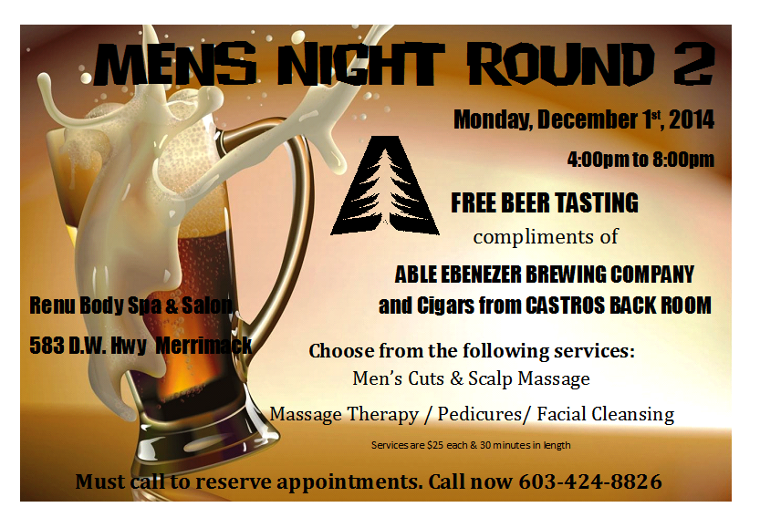 Men's Night Round 2! Renu Body Spa & Salon, Able Ebenezer Brewery & Castro's Cigars are at it again!!! Don't miss it!