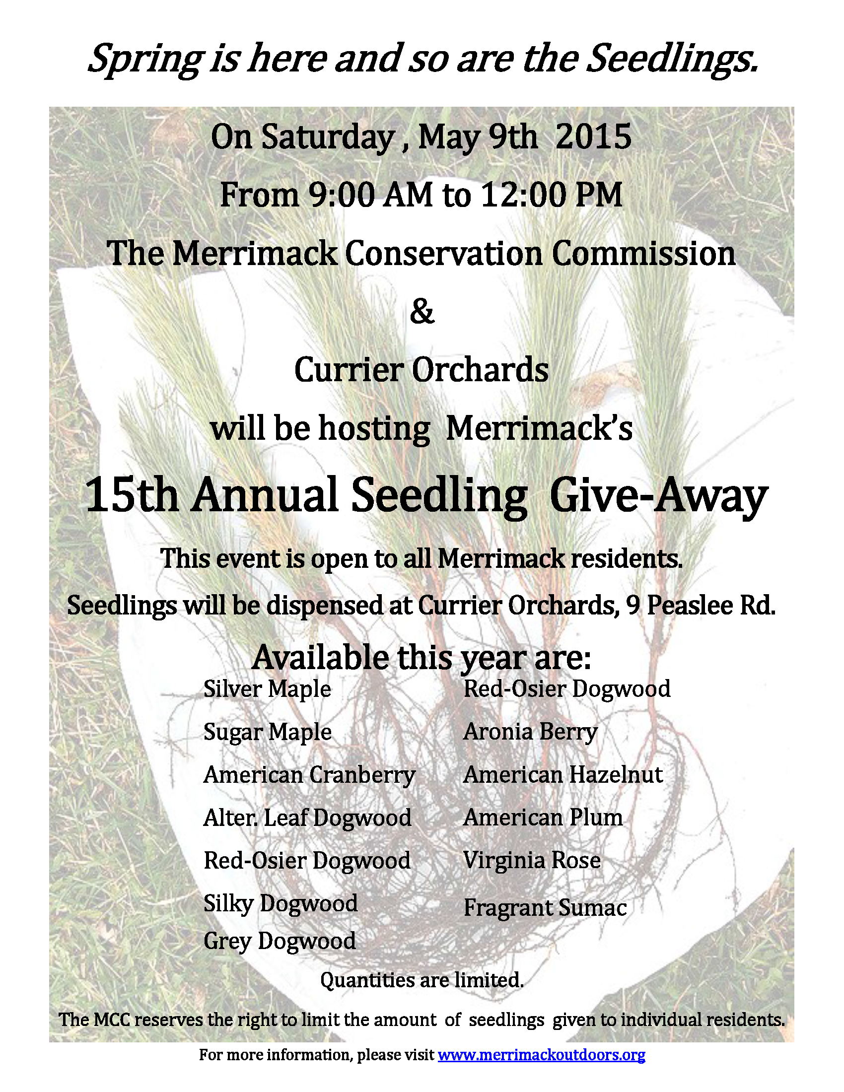 Come rain or shine, on Saturday May 9th, 2015 from 9:00AM to 12:00AM at Currier Orchards, 9 Peaslee Rd, Merrimack, seedlings will be dispensed to Merrimack residents on a first come first serve basis.