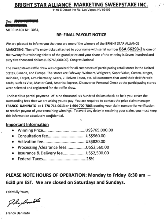 Merrimack Police Department: “Today we took a complaint from a Merrimack resident regarding a possible scam letter and check they had received. The resident provided us with the letter which is pictured below. We knew it was a scam and called the name and number provided on this letter.