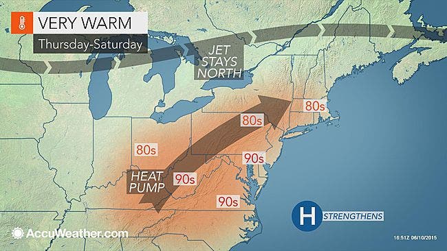 AccuWeather.com meteorologists are suggesting that in some cases, the Northeast could expect a mini-heat wave during the next few days, mixed with some rain on Saturday. Expect warm air and humidity during this time period. Forecasters are also warning that if you exercise vigorously or work in manual labor during the mini-heat wave, make sure you drink plenty of water and take breaks, too.