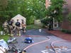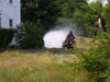 Merrimack Fire Rescue’s run of major emergency calls is continuing. On Monday August 3rd 2015 at 3:17 PM the Fire and Police Department’s were dispatched for a reported motor vehicle accident involving a leaking propane tank at the intersection of Turkey Hill Road and Mcquestion Road. Engine 1, Engine 2, Ambulance 1, Fire Chief Michael Currier, Assistant Chief Richard Pierson and Fire Marshal John Manuele responded. Upon arrival Chief Currier determined that there was no motor vehicle accident, however the underground propane tank in the yard of 45 Turkey Hill Road was damaged and had a large high pressure leak filling the area with propane fumes. As the house is located at the intersection, both Turkey Hill Road and Mcquestion Ed, were closed by the Merrimack Police Department. Engine , under the command of Captain Jay Marsella deployed a hand line and began dispersing the propane gas plume to keep the plume of gas from reaching an explosive concentration. Engine 2, under the command of Captain Matt Duke connected Engine 1 to a nearby hydrant and deployed a second hoseline with a remote monitor to further disperse the gas cloud.