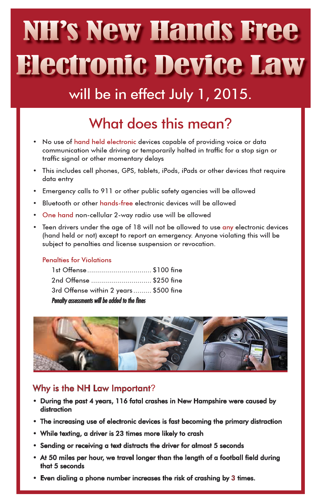 New Hampshire’s Hands-Free Electronic Device Law will go into effect on July 1, 2015. No use of hand held electronic devices capable of providing voice or data communication while driving or temporarily halted in traffic for a stop sign or traffic signal or other momentary delays.
