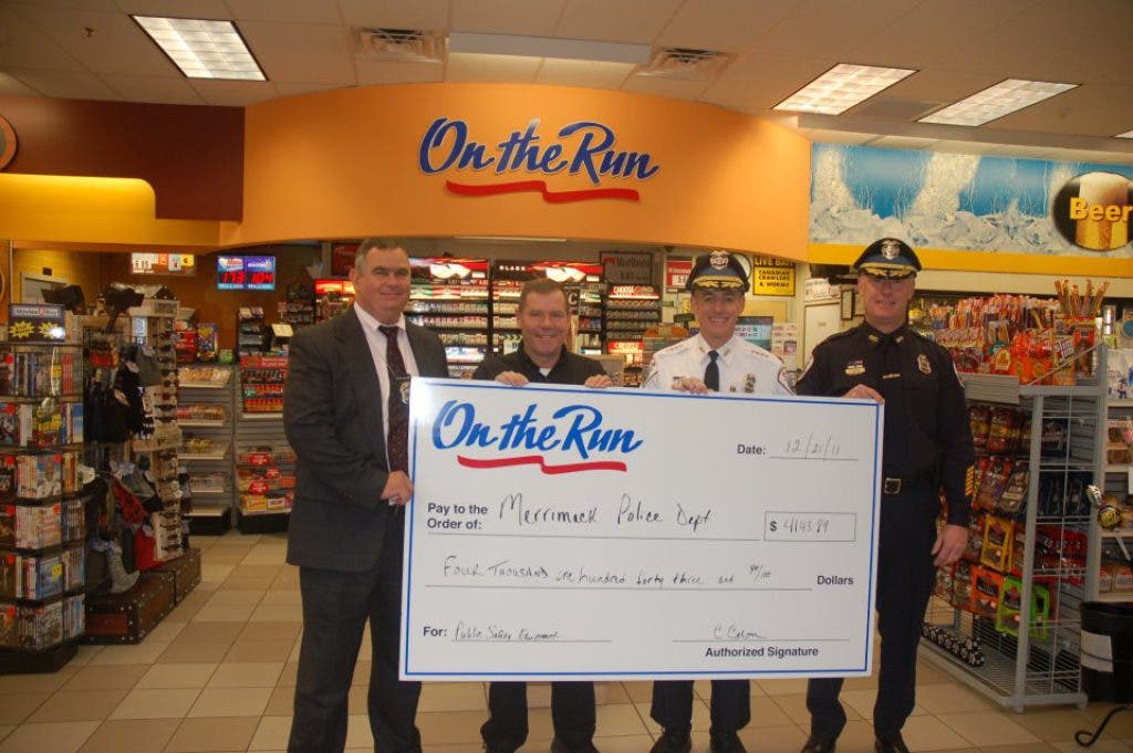 Caron and Son Mobil donated money raised at the gas station in November to the Merrimack Police Department to be used to buy equipment that assists in keeping the public safe.