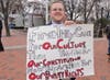 A dozen members and friends of the John Birch Society converged outside City Hall on Saturday holding signs and passing out fliers.