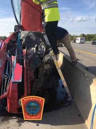 Crash photos: The scene of a passenger vehicle rollover in Nashua on the Everett Turnpike May 24, 2017. (Credit: Nashua Fire Department)