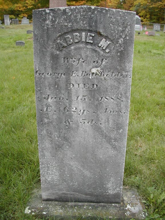 Generation 7: Abigail M. Locke, born 10 September 1825 in South Boston, Massachusetts, died 15 January 1888 in Chichester; married on 7 September 1845 in South Boston to George E. Batchelder; son of Jonathan and Nancy Batchelder, born on 13 August 1822 in Chichester, died 3 April 1848 in Chichester.