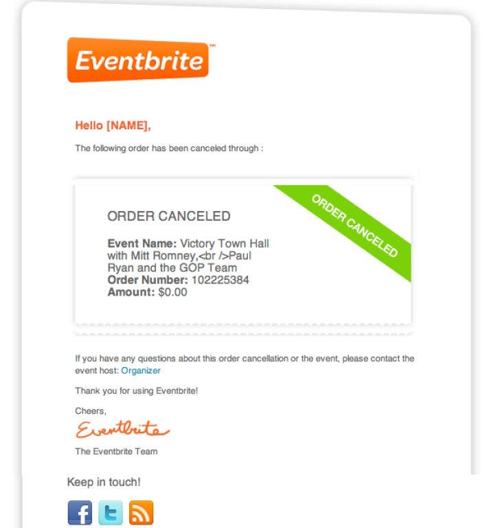 Subject: Order CANCELED for Victory Town Hall with Mitt Romney Paul Ryan and the GOP Team