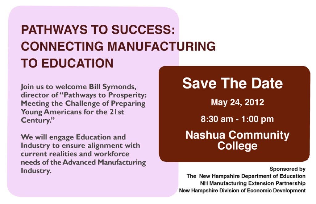 Please join us on May 24! Special guests will include Governor John Lynch, Bill Symonds, Director of the Pathways to Prosperity Project at Harvard University, and New Hampshire’s business, education and elected leaders.