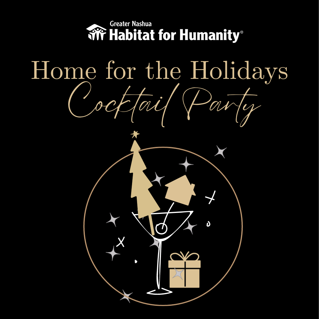 Tickets are on sale for the Greater Nashua Habitat for Humanity's Home for the Holidays Cocktail Party, a holiday-themed fundraising event, held on Friday, December 1, from 5:30pm to 8:30pm at Nashua Center for the Arts, 201 Main Street. The evening will include a cocktail hour, hors d'oeuvres, a short program, live music, and a silent auction.