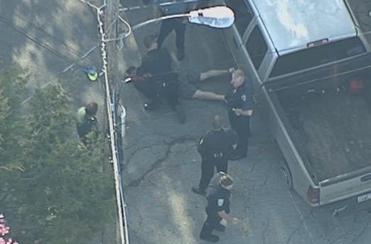 Photo: Officers arrest a suspect who led police on a high-speed chase through Nashua Wednesday. (Credit: WHDH)