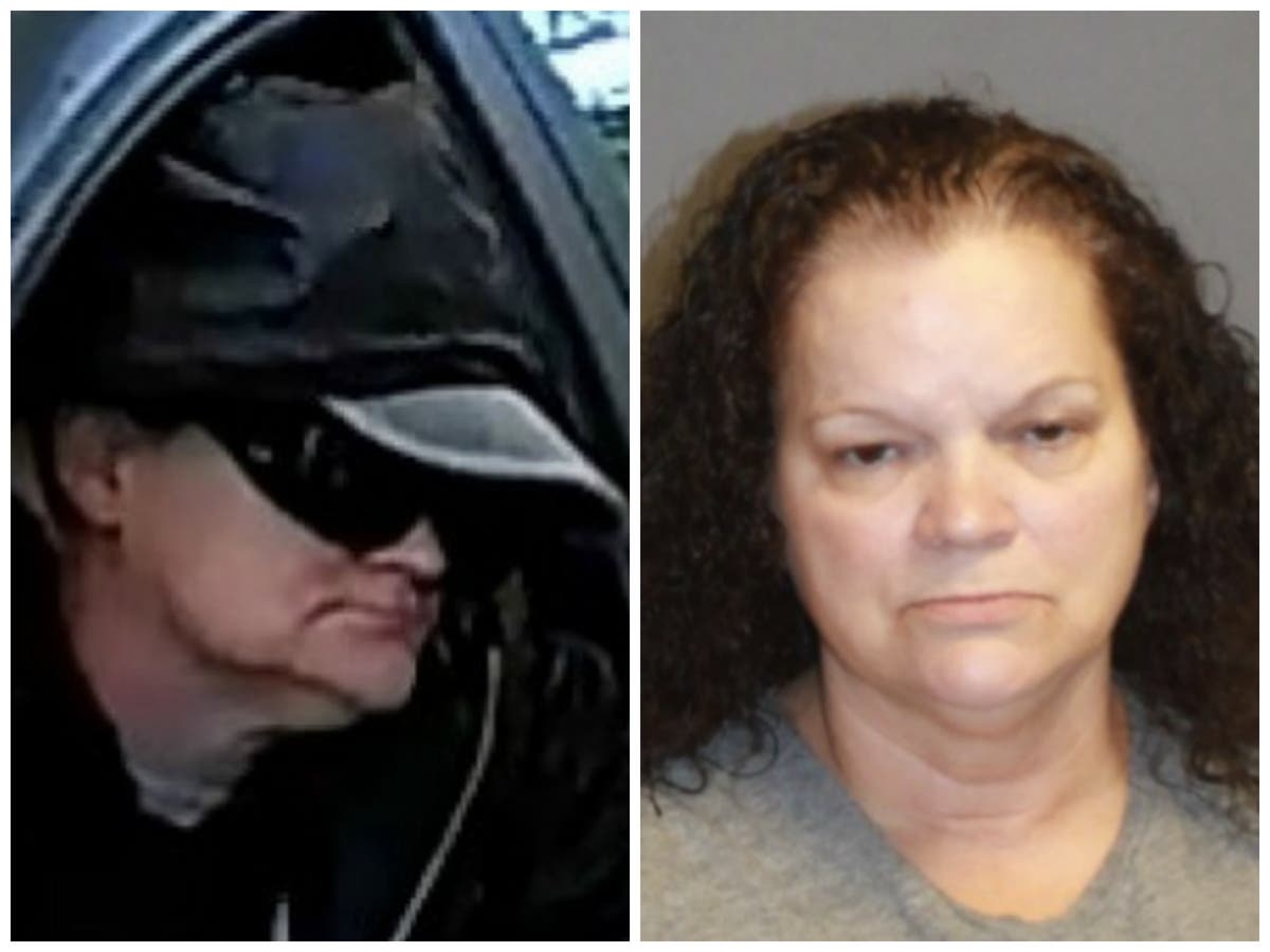 Photos: Maryanne Jacobsmeyer masked during a June home invasion (left), according to police, and her mugshot at right. (Credit: Nashua Police Department)