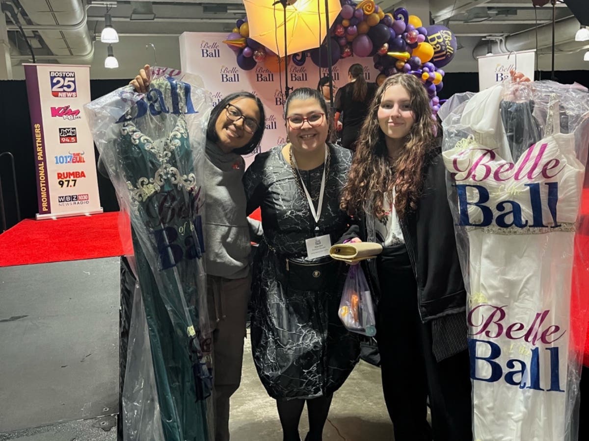 (In photo left to right): Vieira Luxe owner Dina Akel with Maricela Medina (left) and Franyelis Reynoso (right), Lawrence High School students, who were among the more than 1,000 students attending Belle of the Ball at Boston’s Hynes Convention Center.