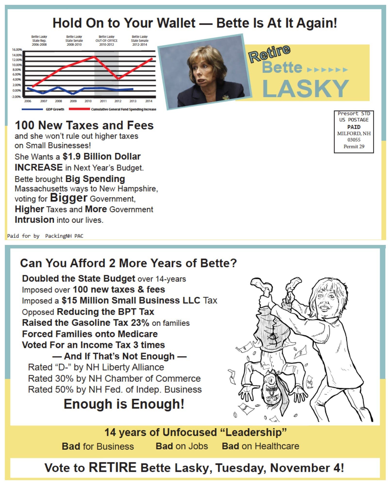 Packing NH has targeted District 13 state Sen. Bette Lasky, D-Nashua, with a new mailer reporting that she helped to institute more than 100 new taxes and fees, as well as voting to increase state spending by nearly $2 billion during her six years in the state Senate.