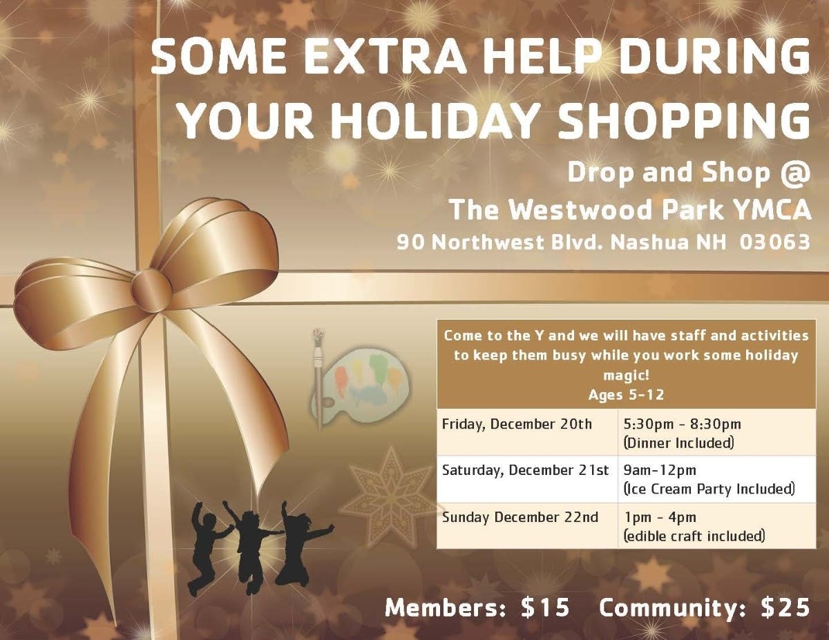 Come to the Westwood Park YMCA and we will have staff and activities to keep them busy while you work some holiday magic! This is open to kids ages 5 to 12. Cost is $15 per child per day for YMCA members; $25 per child for the community. The Westwood Park YMCA is located at 90 Northwest Blvd. Nashua NH 03063.
