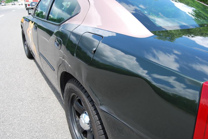 Photo: Damage to a State Police cruiser after it was sideswiped by a tractor-trailer in Nashua Wednesday. (Credit: NH State Police)