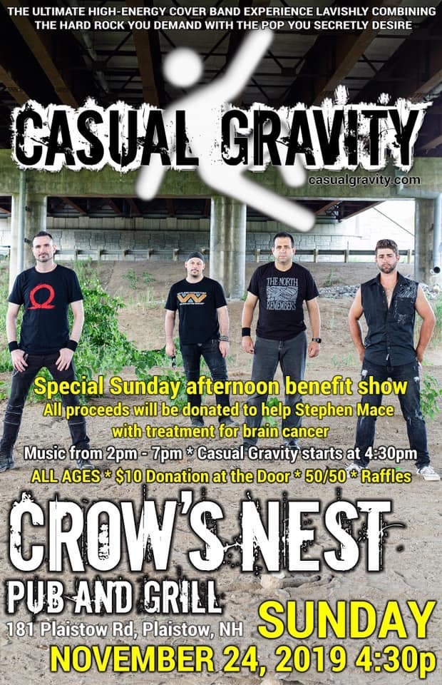 If you’re looking for something to do this Sunday, CASUAL GRAVITY will be performing for a benefit at the the Crow’s Nest in Plaistow! All are welcome!