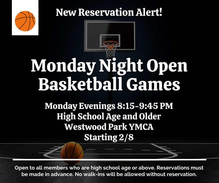 Starting this week the Westwood Park YMCA branch will be offering "Open Basketball Games"! The games will run on Monday evenings from 8:15-9:45 PM and are open to members only who are in high school or older. These games will have a strict limit of 12 players total, and all players MUST make a reservation to play. No walk-Ins will be allowed without a reservation. Reservations will become available 48 hours in advance of the game. Games are for recreational purposes, so there will be no scorekeeper or referees.