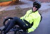 When he gave up traditional bikes about seven years ago he first tried a two-wheeled seated bike, but felt he lacked stability, so he switched to a three-wheeler. Normally he uses a tall flag attached to the trike to make himself more visible to motorists. He also has flashing lights on the front and back.