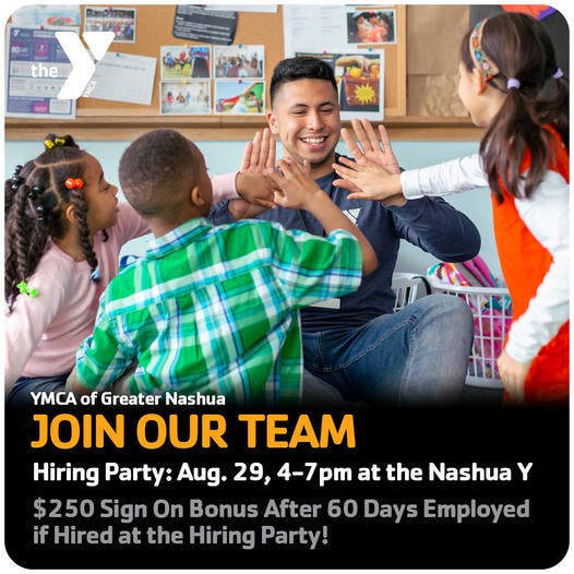 YMCA OF GREATER NASHUA HIRING PARTY: We want you to join our team. We have a number of current job openings we're filling. Those hired at the event can earn a $250 sign-on bonus after 60 days employed. Join us August 29 or apply online. Learn more: www.nmymca.org/hiringparty #NMYMCA #Jobs #BeCauseY