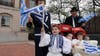 Blue-and-white flags waved in the chilly morning air Saturday, as about 40 members of the local Greek community gathered in unity for a brief celebration – one day early – of Greek Independence Day.