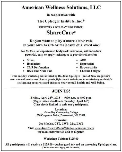 American Wellness Solutions, LLC, New Hampshire’s premier provider of worksite wellness consulting services, is hosting Upledger Institute’s ShareCare workshop, according to a press statement.