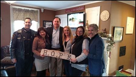 Caption: At Hope on Haven Hill: Rochester Police Chief Michael Allen, Co-founder Kerry Norton, Rep. Frank Guinta, recovering mother Abi, Co-founder Colene Arnold, and Fox News’ Geraldo Rivera